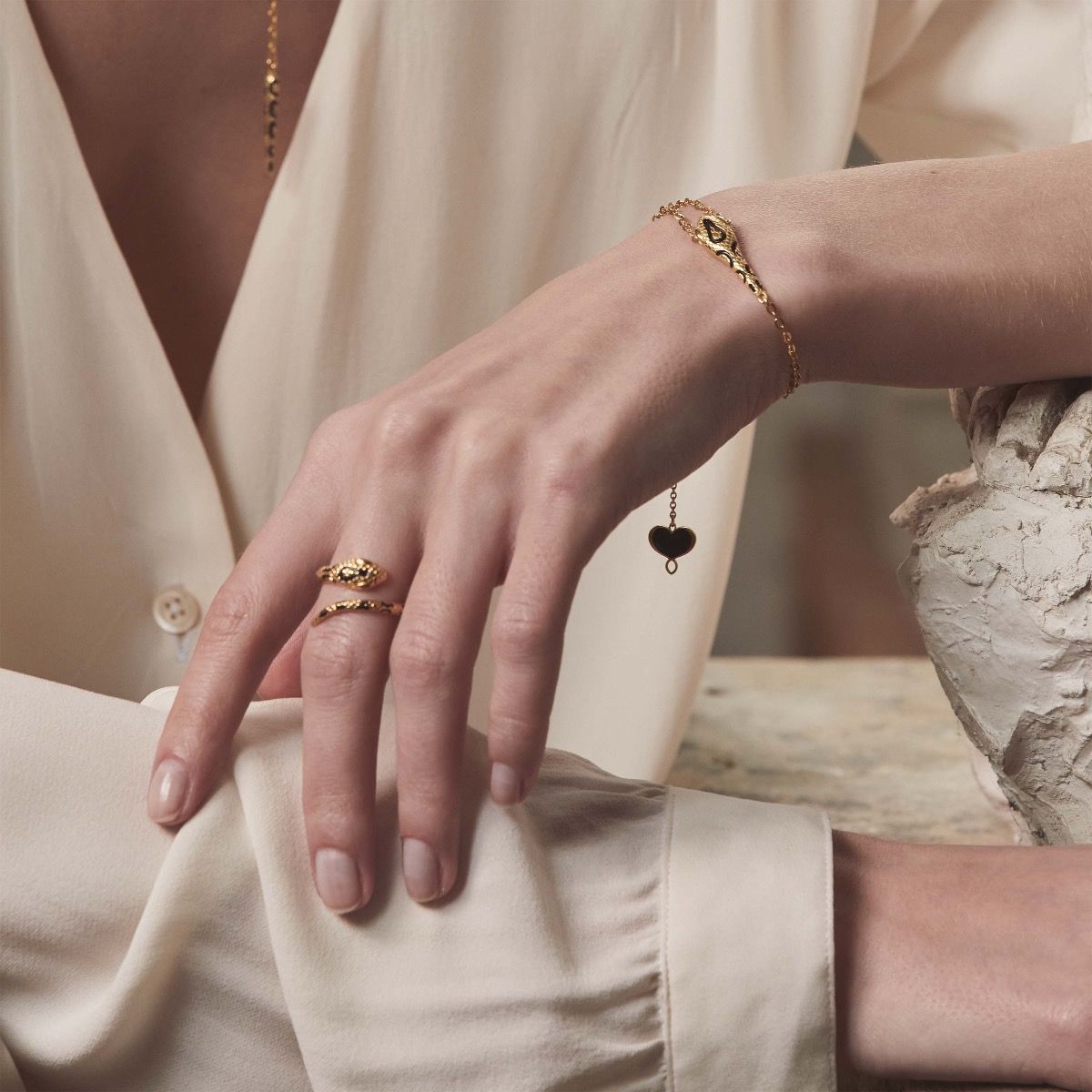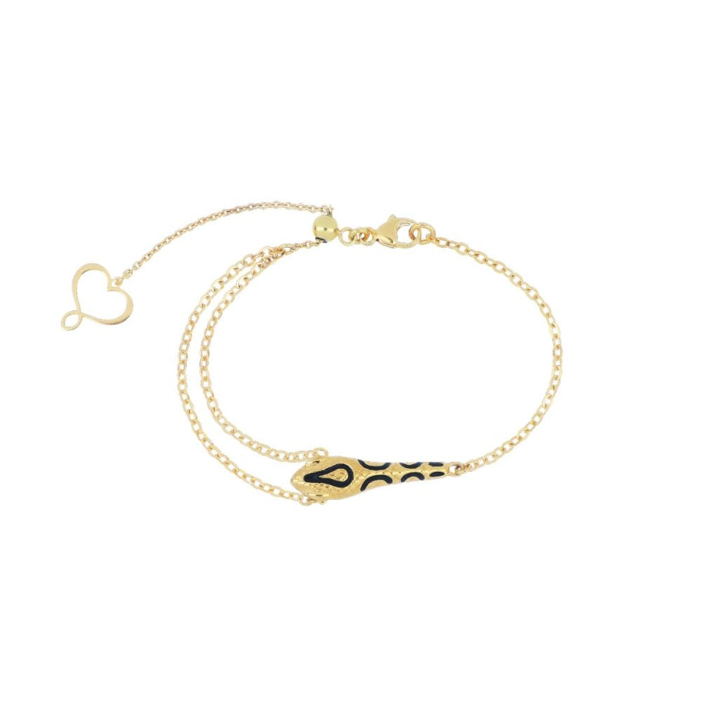 Bracciale realizzato in argento 925 con galvanica oro giallo ad alto spessore e resistenza. Presenta una testa di serpente con striature nere al centro. Può essere regolato fino ad un massimo di 18 cm grazie alla piccola sfera scorrevole. È presente il cuore Maman traforato all'estremità. Chiusura a moschettone.