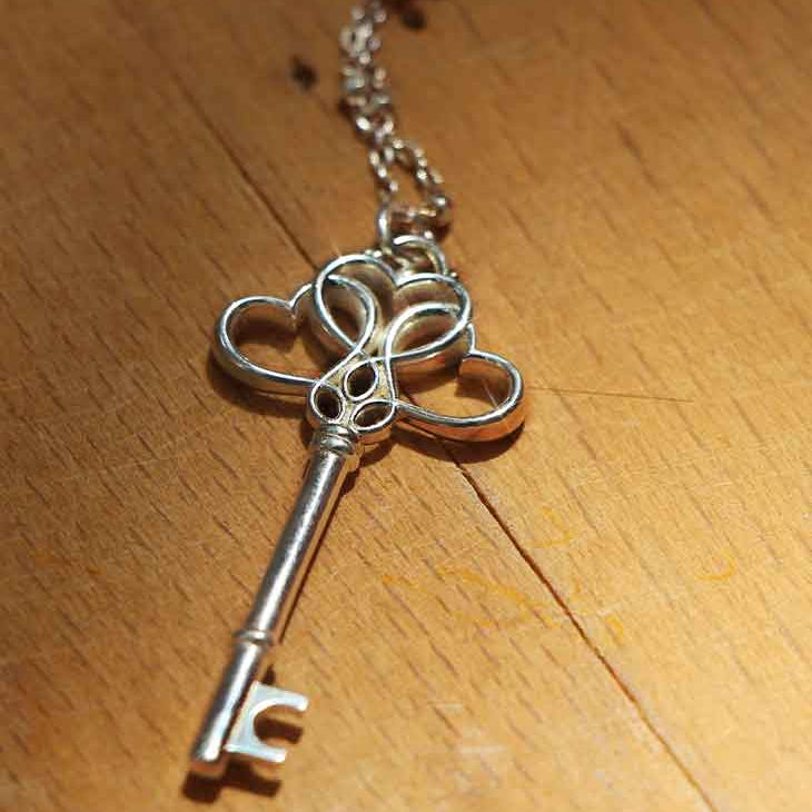 Presenta una chiave pendente con decorazione di cuori maman intrecciati e catena con sfere argentate.