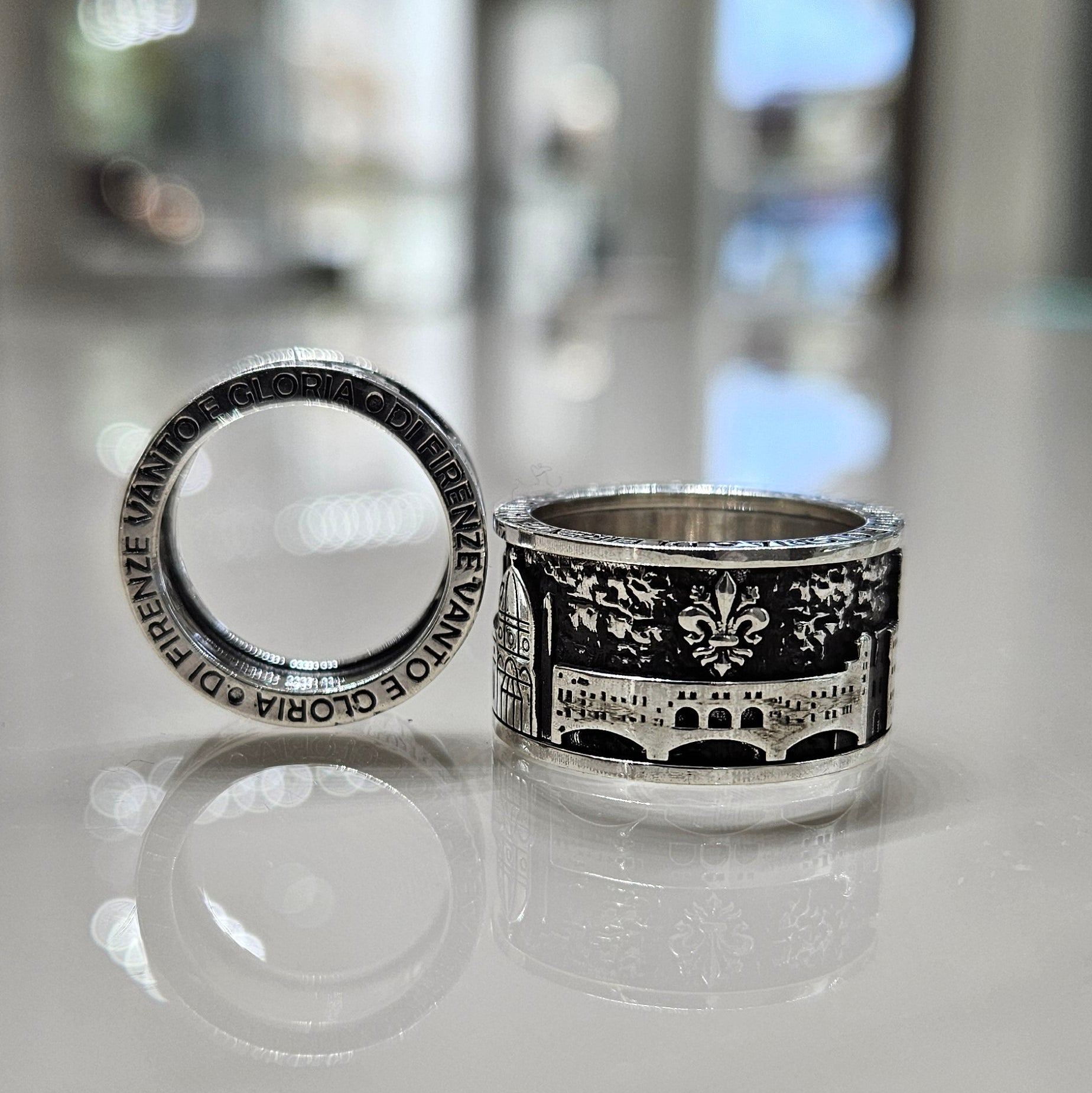 Anello realizzato in argento 925 con lo skyline dei monumenti più famosi di Firenze. Spalletta con iscrizione Di Firenze Vanto e Gloria.
